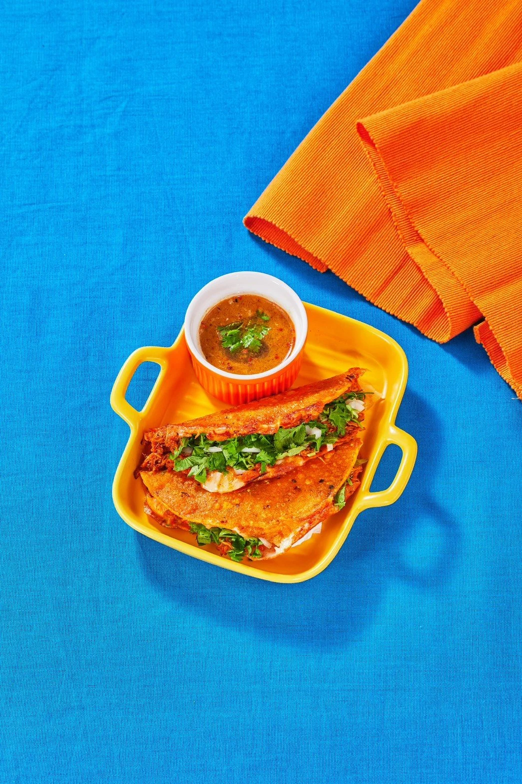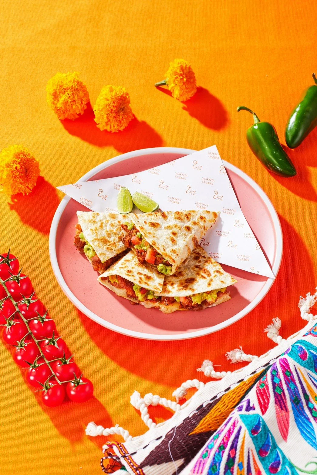 Grilled and folded tortillas filled with melted cheese, Pinto beans, fresh salsa, guacamole, sour cream and your choice of meat or vegetarian. Also available in small appetizer size